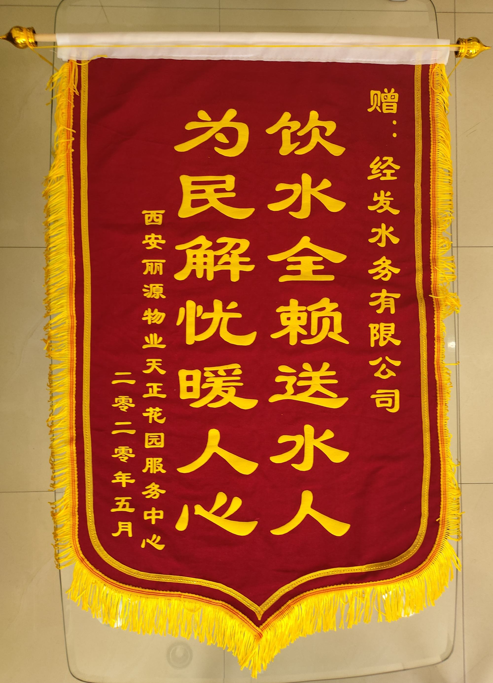 近日,西安丽源物业天正花园服务中心将一面写有“饮水全赖送水人,为民解忧暖人心”的锦旗送到经发水务客服大厅,对经发水务的优质服务表示感谢。